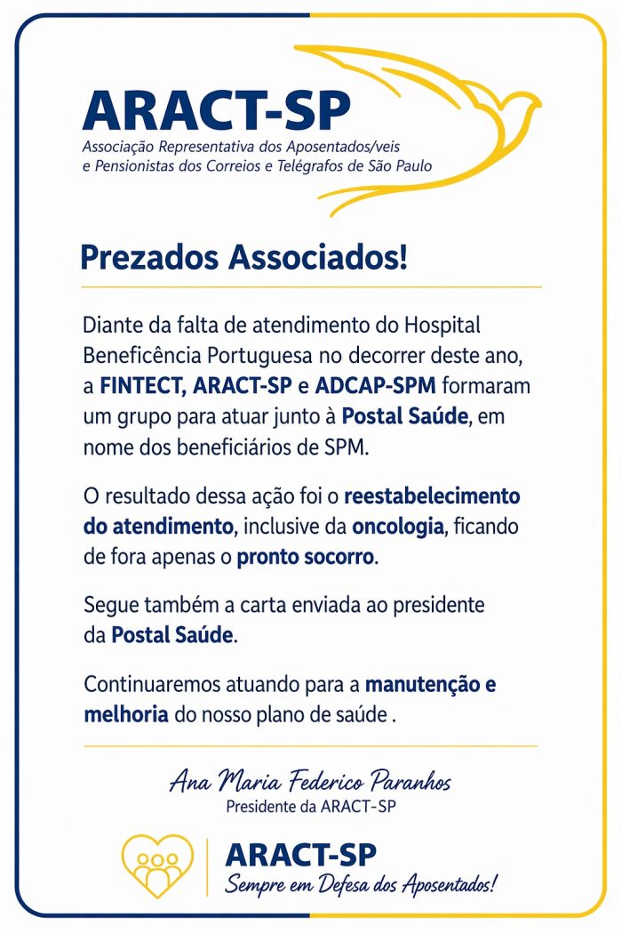 Aract-SP, ADCAP-SPM e Findect conquistam reestabelecimento do atendimento do Hospital Beneficência Portuguesa Aumentar/diminuir o texto: Leia a carta conjunta enviada ao presidente da Postal Saúde CARTA CONJUNTA POSTAL SAUDEBaixar Publicada dia 15/04/2026 17:09 Compartilhe agora com seus amigos FacebookWhatsApp